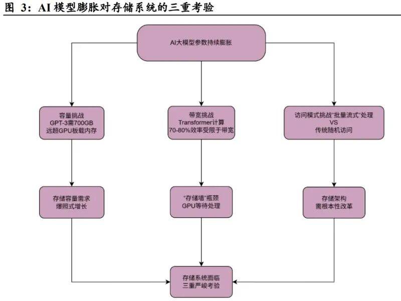 大模型参数持续膨胀对存储提出更高要求。从 2012 年 AlexNet 的 6000 万参数,到 2023 年 GPT-4 的 1.8 万亿参数,十年间 AI 模型参数规模增长了 3 万倍。这种指数 级增长对存储系统构成了三重严峻考验:容量上,GPT-3 全精度参数存储需要 700GB, 远超传统 GPU 板载内存;带宽上,Transformer 层计算效率 70%-80%受限于内存带 宽;访问模式上,AI批量流式处理与传统计算的随机访问差异显著,进一步加剧 了存储压力。